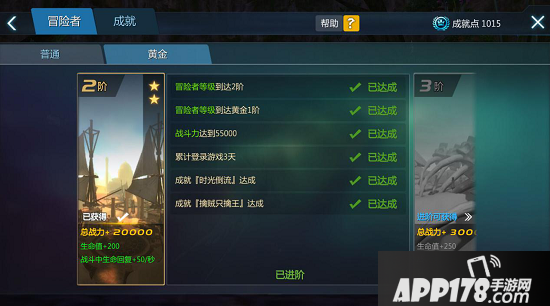 黄金冒险者的任务则围绕着玩家在游戏中的冒险旅程展开,需要玩家完成各式各样的成就达成升星条件,基础的任务也有目标战力,累计通关英雄副本等。