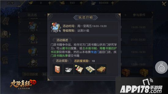 门派夺书的活动时间是周一到周五的19:00—19:30,需要玩家达到31级方可参加。在夺书过程中,可以通过传送前往其他门派藏书台搜集书籍,也可通过击杀偷书贼和背着书篓的玩家获得书篓,从场景传送门返回门派,找到门派书籍执事提交书籍,获得奖励。
