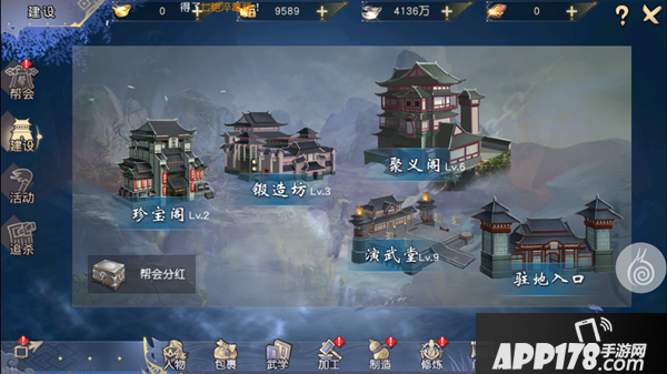 帮会建设主要分为珍宝阁、锻造坊、聚义阁、演武堂和驻地入口,其中珍宝阁可以兑换宝箱、钥匙、草料、马鞭等材料;锻造坊可以锻造地盘战所需的强力道具;聚义阁可以增加帮派的人数上限,演武堂可以让帮会成员自行修炼提高自身属性,驻地入口可让玩家自由进入帮会驻地,玩家也可在帮会建设界面领取帮派分红。