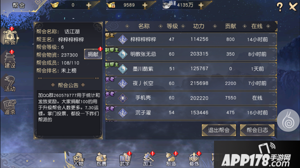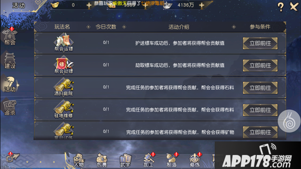 目前开设的帮会活动主要有帮会运镖、帮会劫镖、洒扫庭院、驻地维修、掌劲试炼、力擒凶兽、帮会操练、严防内贼等,参与这些活动可以让帮会获得帮会贡献值、木材、矿物、布料等资源。