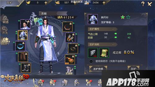 加护也是提升装备属性的重要途径之一,玩家通过加护主要提升自身的气血上限、防御和攻击。加护需要消耗精铁矿,精铁矿数量和等级越高,成功率越高,加护成功即可提升玩家属性和功力。加护所需的精铁矿主要来源于江湖豪杰、元帝宝藏、以及比武商店的荣誉兑换和商会购买。