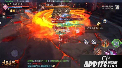 接下来护送小乌龟之后,就会遇到通天峰中的第二个boss万年火龟。万年火龟会给自己添加一个持续一定时间的灼热状态,靠近的大侠会受到伤害,大侠们在打这个boss的时候,尽量不要硬扛,在万年火龟放技能的时候及时避开,或者先格挡再轻功走开,等待boss技能释放结束后全力输出。