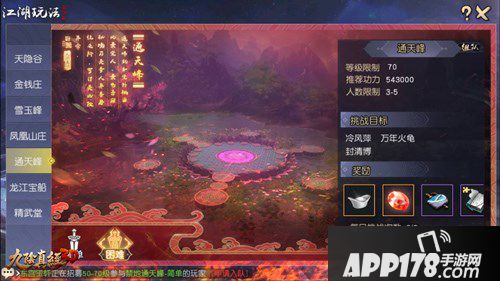 初至通天峰莲池,便遇一白发魔女于此修炼,乃是江湖中声名狼藉的鬼爪骨女冷风萍。大侠们须合力击败之,有侍女三人立于周身水面平台,会以冰柱和旋风阻挡大侠前进,注意躲避陷阱。击败冷风萍后,将邂逅一只落难珍兽小火龟,大侠须护送其归巢,成功击杀沿途小怪。幼龟归巢,出现万年火龟。击败火龟后,玩家继续前行,深入通天峰腹地,大侠可自由选择砍倒五行旗中的一面获得不同增益效果,而后出现封清博,将其击败赢得副本胜利。