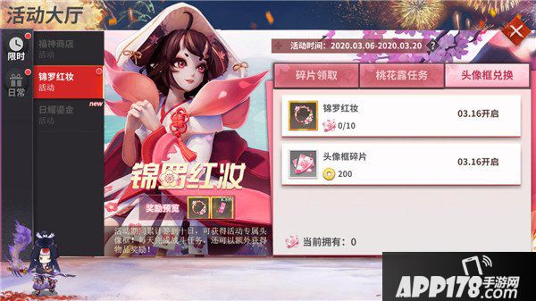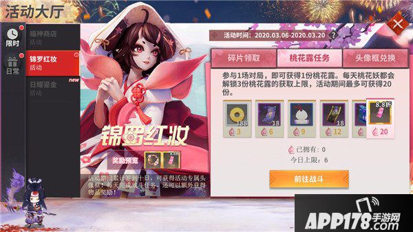 春织锦罗,早理红妆。在一年中最美的时光里,大人们总希望换上华美的服装,点缀上精致的妆容。3月6日游戏维护后-3月20日活动期间,《决战!平安京》每天都将为阴阳师大人们准备3个桃花露任务,大人们完成对战即可获得专属道具[桃花露],获取足够多的[桃花露]后,即可领取包含[女性式神折扣券]等在内的丰厚奖励。累计在活动界面签到10天,还可免费领取[锦罗红妆]专属头像框。