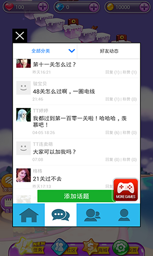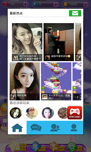 游戏社区,简单的说就是游戏玩家和玩家之间讨论游戏的地方。 社区是群体或社会组织聚集在某一个领域里所形成的一个生活上相互关联的大集体,我们可以看到近期活跃的玩家和身边的好友,你可以互加好友一起玩耍,你也可以和朋友们比赛,看谁的分数高,谁先笑到最后。