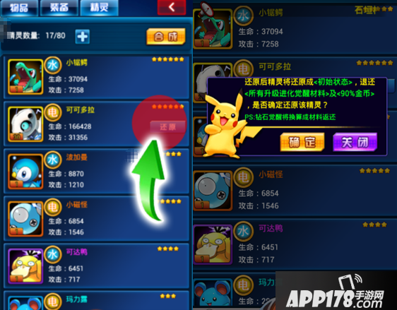 精灵进化(还原/降星):对于暂时不用的精灵,己经升了等级、进化。但现在想取消浪费在上面的金钱、经验,进化材料。就可以使用这个功能。
