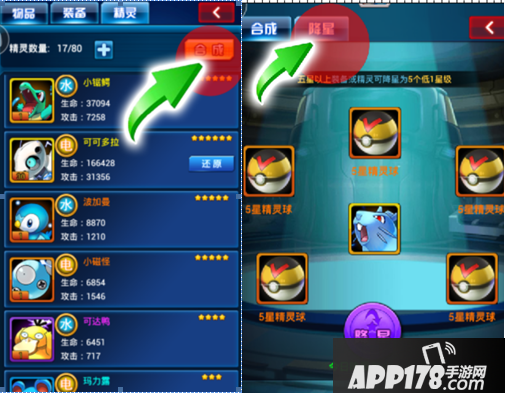 方法:打开背包,在精灵栏中找到合成。点击降星。会得到五个降星后的精灵球,然后再去合成。