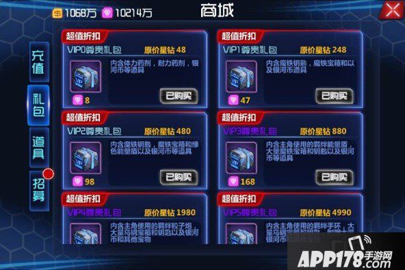 在游戏界面的右上角有“充值”按钮,进入之后点礼包,不要以为商城是土豪玩家的天堂,就算是VIP0的玩家也可以享受到超值的优惠哦。