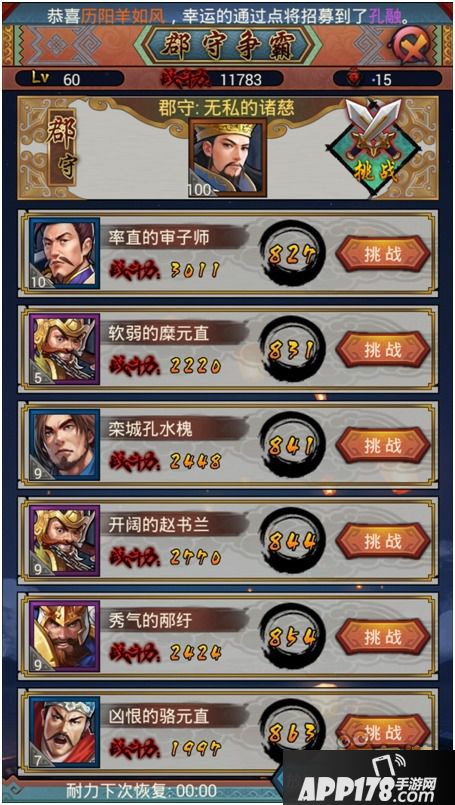 玩家可挑战其他玩家,无论胜利或失败都会给予声望,每次挑战消耗1点耐力;耐力为0时可通过元宝购买或等待时间回复;1小时回复1点