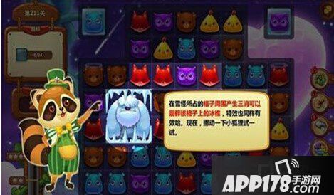 开心消消乐211关三星通关攻略,在指定的步数内完成冰块的清除,这关大家会遇到一个特别的障碍出现,可以说它是一个双面性的消除成就,长的不似大家喜欢的小巧身姿,雪怪就是冰的生成者,玩家可在这个期间多做竖直或者是交换的特效,干掉它的好处是能带走部分很难消除的目标物。
