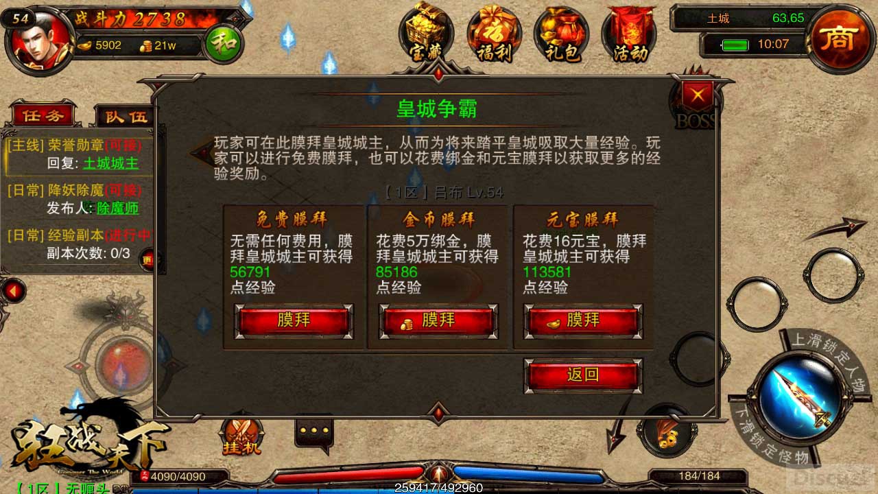 3.皇城城主上线受万人膜拜,并可在皇城争霸掉相处领取城主福利!