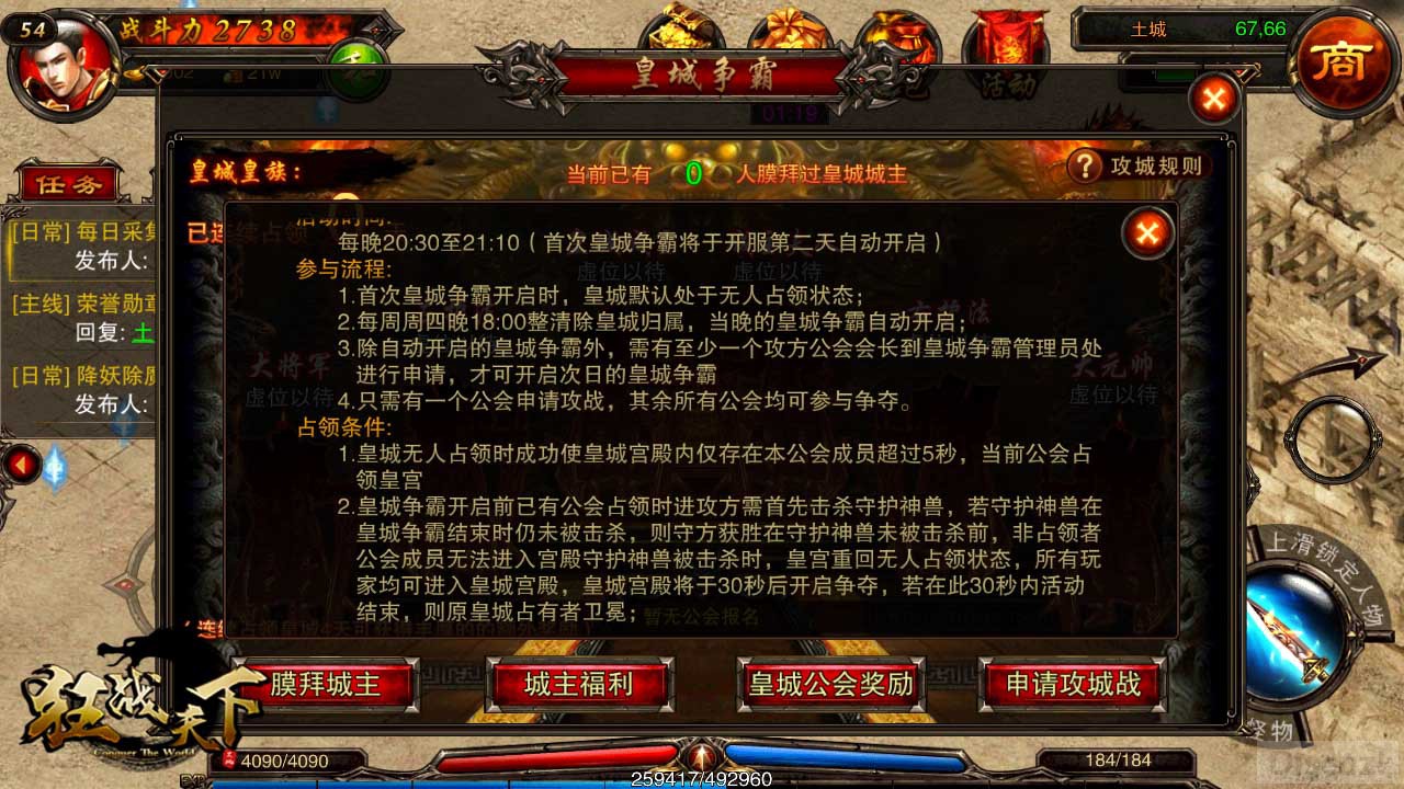 注:除自动开启的皇城争霸外,需有至少一个攻方公会会长到皇城争霸管理员处进行申请,才可开启次日的皇城争霸。