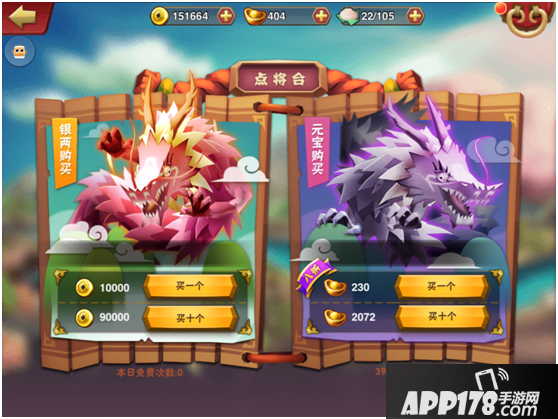 b. 有钱能使鬼推磨,通过在“点将台”花费银两或者元宝抽奖获得。银两只能获得星级比较低的武将,高级的武将自持身份,要用元宝勾引,所以——元宝十连抽,必须的!如果抽到已有的武将,会自动转换成碎片,用于武将的升星使用,星级越高,武将的属性越好。