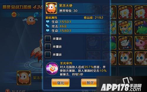 精灵技能圣光审判:对大范围敌人造成357%伤害,并使敌方暴躁,敌人暴躁时受击10%被暴击,持续5秒(持续时间由强化等级决定,强化越高持续越久)