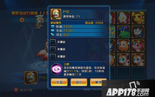 精灵技能引燃:攻击有概率使敌方虚弱,攻击伤害31.5%,持续5秒,10秒内最多触发37次(持续时间由强化等级决定,强化越高持续越久)