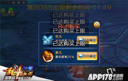 3.进入BOSS场景时,首先会于屏幕中央弹出一个小弹窗,玩家可选择性的购买一个BUFF的加成,而BUFF仅为本次BOSS战有效。
