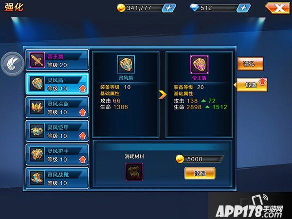 除了强化以外,提升装备的方式还有锻造。玩家可以通过锻造来让装备进行升阶,只要满足锻造需要的卷轴、金币、等级后,就可以进行装备升阶,让你的装备属性大幅度提升。