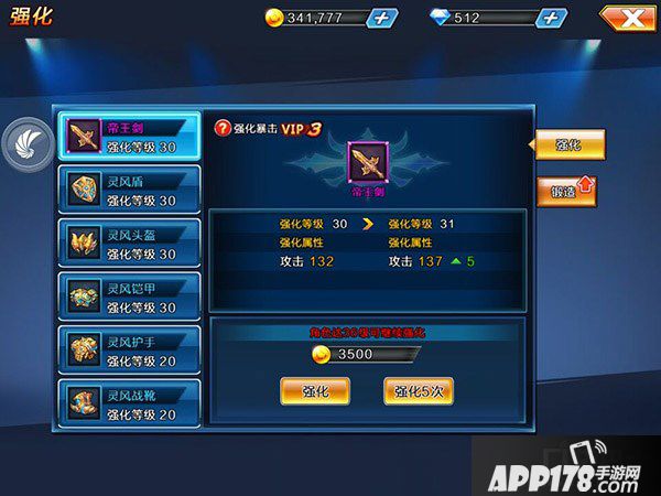 点击强化按钮后,会跳出装备界面供玩家选择武器强化。玩家可自由选择“强化”或者“强化5次”来进行强化装备。强化过程中偶尔还会出现额外的暴击效果,提升装备的强化效果。