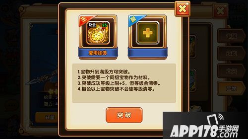 当宝物强化至等级上限以后,即可使用同样档次、同样等级的宝物作为材料来进行突破。