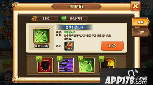 策略府是升级科技的地方,玩家可以在这里提升自己的铜钱、木材产量,也可以升级各种小兵技能,让小兵在战斗中发挥更大作用!