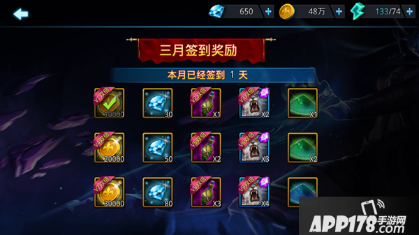 签到:签到公用两种模式“七日登录”与“每日签到”,七日登录奖励给予的钻石十分丰富,但是无法重复循环获取,每日奖励则为一个月刷新一次。上游戏的同时点一下签到,那么金币钻石英雄都会拥有。