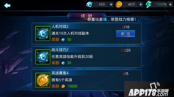 成就:成就中较为简单的可获取钻石的有冒险模式的通关,竞技场的参加与英雄的提升,这些是你成长之中必经之路所以这些钻石请合理搭配使用。