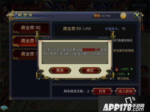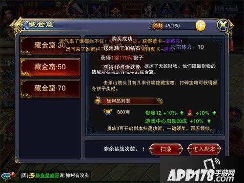游戏中的藏金窟分为30级,50级,70级三个等级,每个等级难度和奖励都有所不同。玩家们每天可以挑战3次,每次消耗10点体力值。
