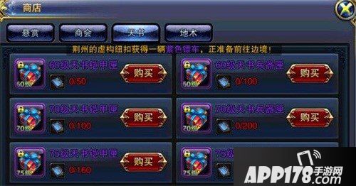 在程昱这里,玩家可以消耗悬赏令、商会令、天书残卷、地术残卷来兑换自己所需要的装备和坐骑。