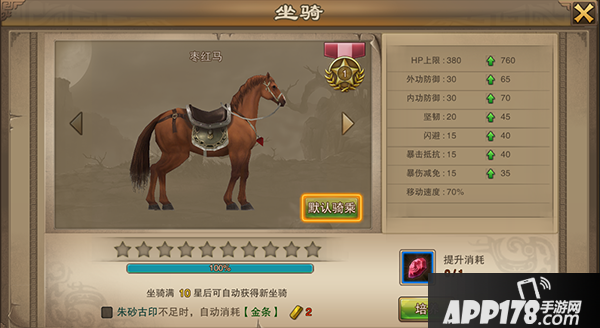 2、坐骑通过消耗朱砂古印来升星,当达到10星之后就可以获得新的坐骑,新的坐骑外观更酷炫,战力也更高哦。用来升星的朱砂古印可以通过副本青乌子墓获得。