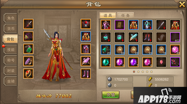 装备是提升战力的最便捷的途径。总共有10件装备,装备分等级和资质,每20级一个等级,每个等级分白、绿、蓝、紫、橙五个资质。
