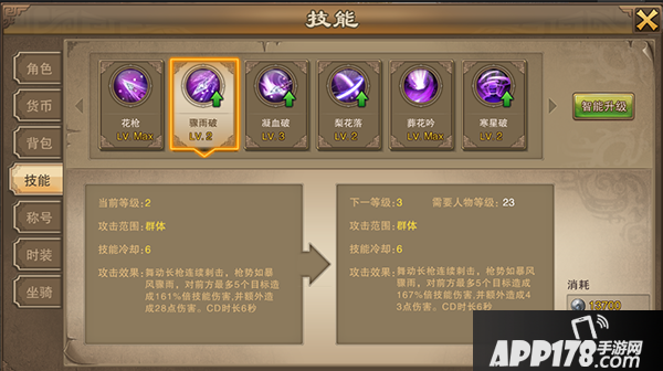 目前总共有七个技能,打开角色面板点击升级技能,升级技能消耗绑银,小伙伴们记得去打银币副本哦!长按主界面技能按钮可以快速切换技能哦!