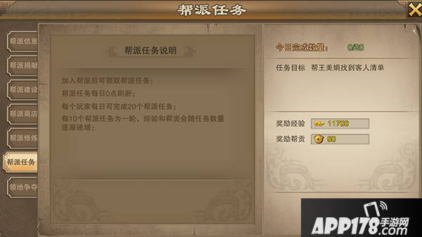 1、加入帮派之后,每天可以通过活跃面板领取20个帮派跑环任务,做完之后可以得到大量经验和帮贡。