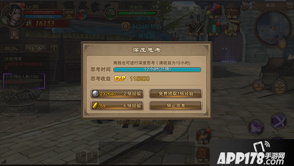 无论在线离线都可以通过深度思考获得不菲的经验,也可以通过消耗银币或者金条来领取不同倍数的经验。