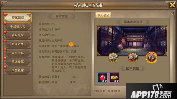开启等级:齐家当铺的开启等级皆为25级,但只有通关简单本才能挑战普通本,通关普通本才能挑战困难本。