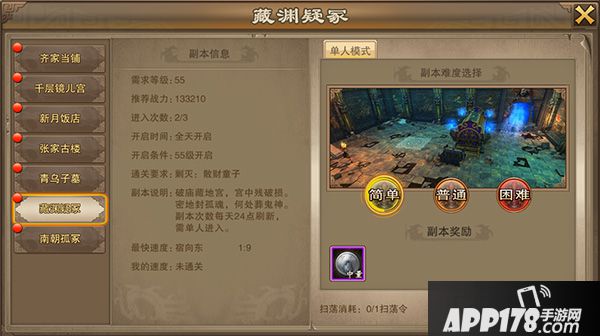 玩法说明:藏渊疑冢为单人挑战副本,共分简单、普通、困难3种难度,需要在20分钟之内通关,过时则挑战失败。
