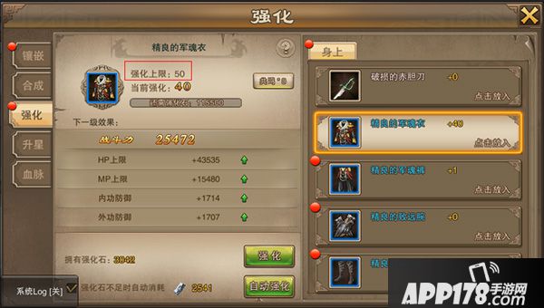 选择想要强化的装备,点击强化按钮就可成功强化了,也可使用自动强化按钮自动强化装备,使用自动强化将自动强化装备到到顶级或者消耗掉所有的强化石后,强化结束,可以手动停止自动强化。