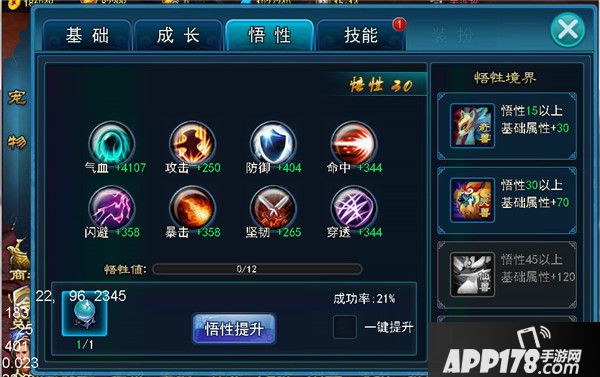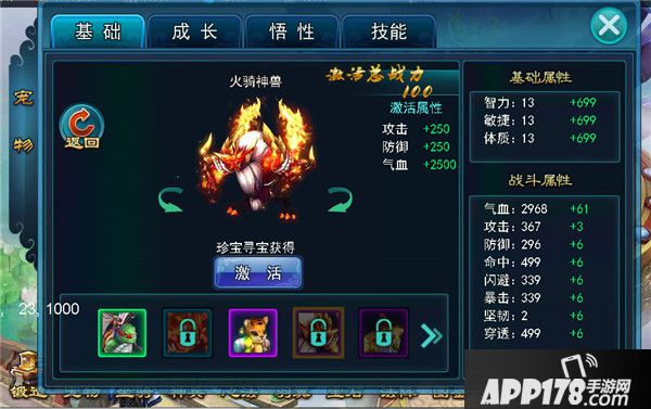 当角色到达45级时可以开启宠物悟性,提升悟性可以获得大量属性加成,每天都可以免费提升一次悟性;悟性达到一定条件还可以激活悟性境界:奇兽、灵兽、仙兽、神兽、圣兽,每达到一定阶段,都可以获得额外战力加成。