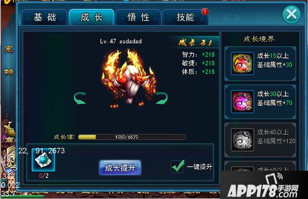 当角色到达32级时可以开启宠物成长。提升成长可以获得大量属性加成。玩家每天都可以免费提升成长一次。成长达到一定条件还可以激活成长境界:元阶、玄阶、人阶、地阶、天阶,每达到一定阶段,都可以获得额外战力加成。