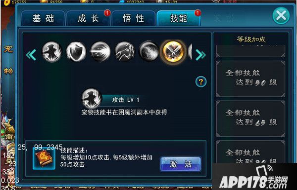 宠物技能书可在商城中购买,技能修炼达到一定等级后还有额外的属性加成。