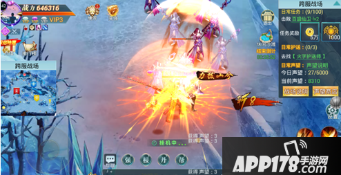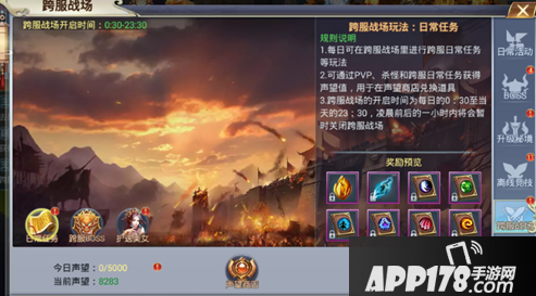 跨服战场是一片独立的空间,玩家在这里可以进行跨服日常任务、抢夺跨服BOOS、还有跨服护送美女等等。其中完成简单的日常任务击杀跨服战场的怪物之后,可以直接获得大量的铜钱奖励,和用来兑换各类技能书的声望奖励!