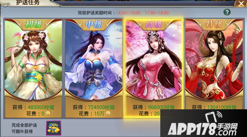 还有跨服护送美美女,每天可以护送3次,而且每天的14:30~15:00、17:30~18:00完成护送任务可以获得双倍的奖励,抢夺别人护送的美女还可以获得大量铜钱奖励哦。
