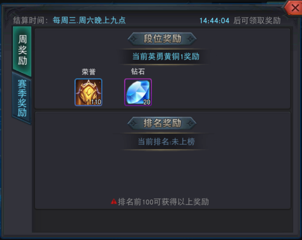 排位赛奖励主要分为周奖励及赛季奖励。周奖励每周三、周六晚9点结算,根据当前段位排名发放钻石、荣誉奖励,同时排名前100可额外获得丰厚奖励。赛季奖励根据每赛季结束时间发放段位奖励及排名奖励。