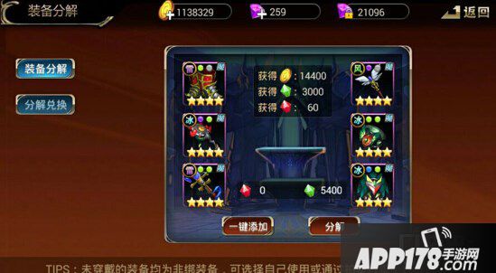 背包里不需要的四星五星的装备可以拿来分解掉,收获金币的同时还有绿晶石、红晶石。