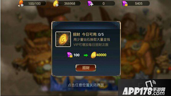 最后还有一个方法不得不提,采用这个方法你能获得大量金币。那就是“招财”,点击带加号的金币图标你能够看到“招财”按钮。通过招财可以直接大量的获得金币,前提是你的钻石足够;当然前面的几次还是比较划算的~-~。