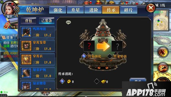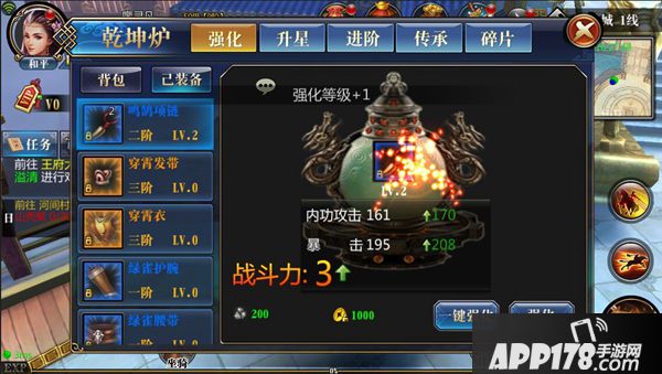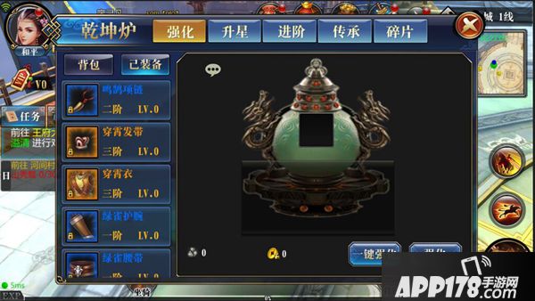 在乾坤炉界面中,可以对装备进行强化、升星、进阶、传承等操作。