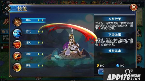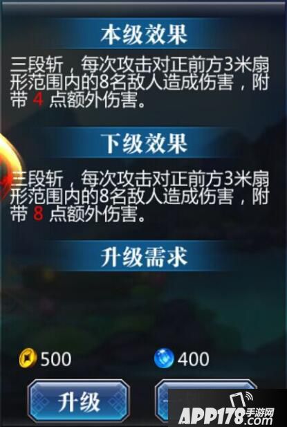 在《六扇门》中,技能效果分为本级效果和下级效果,通过提升技能等级,可以增强效果。技能升级,首先选择想要升级的技能,通过升级或一键升级按钮,消耗金币和真气完成技能升级。