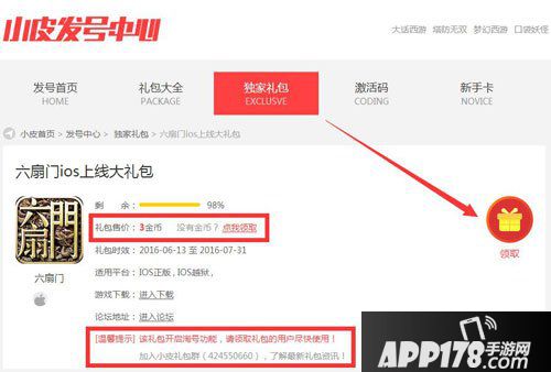 4、领取礼包需要花费APP178金币3个,如果您没有金币,点击进入APP178论坛可以了解金币的获取途径。