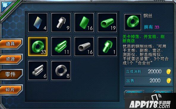 零件:零件是用来升级战舰部件所需要的零件,零件也是需要管卡掉、开宝箱和商店购买获得。在背包的零件栏里够查看你所具有的零件和数量。