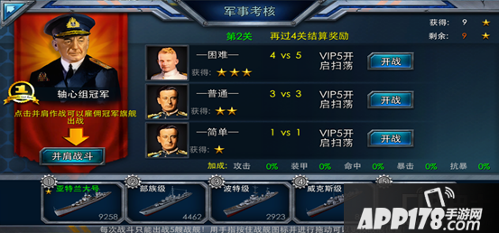 首先,在军事和考核前,我们得分批次进行,也就是打同盟组时先把自己所有好的海员全部配备到自己的几个主力轴心舰只上,这样才能做到资源分配最优化;同理,打轴心组时将好的海员配备到同盟国舰只上。其次,如果自己有的舰只实力和主力舰只相差太远,建议就不要上阵了,不然很容易被击沉,就算赢了,得星也不高。然后一上来先不要使用“并肩作战”,自己以最优配置先打,最好每次都选择困难打法,每次选择最高的奖励(有钥匙或者宝箱的就另当别论),每次当你实力远超电脑时,每一局都会有“跳过战斗”的选项。当打到一定程度,电脑实力已经接近自己时,战斗中将不再出现该选项,此时,一定要记得赢得该战斗后,下面的战斗最好就要花点钱选择冠军“并肩战斗”,这样,你的军事考核才能走的更远。