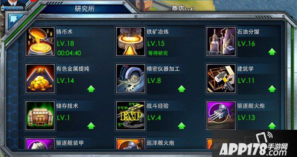 研究所本身是不用升级的,《雷霆舰队》中不需升级的建筑共有三个,分别是研究所、作战中心、酒吧。然后我们回到研究所。
